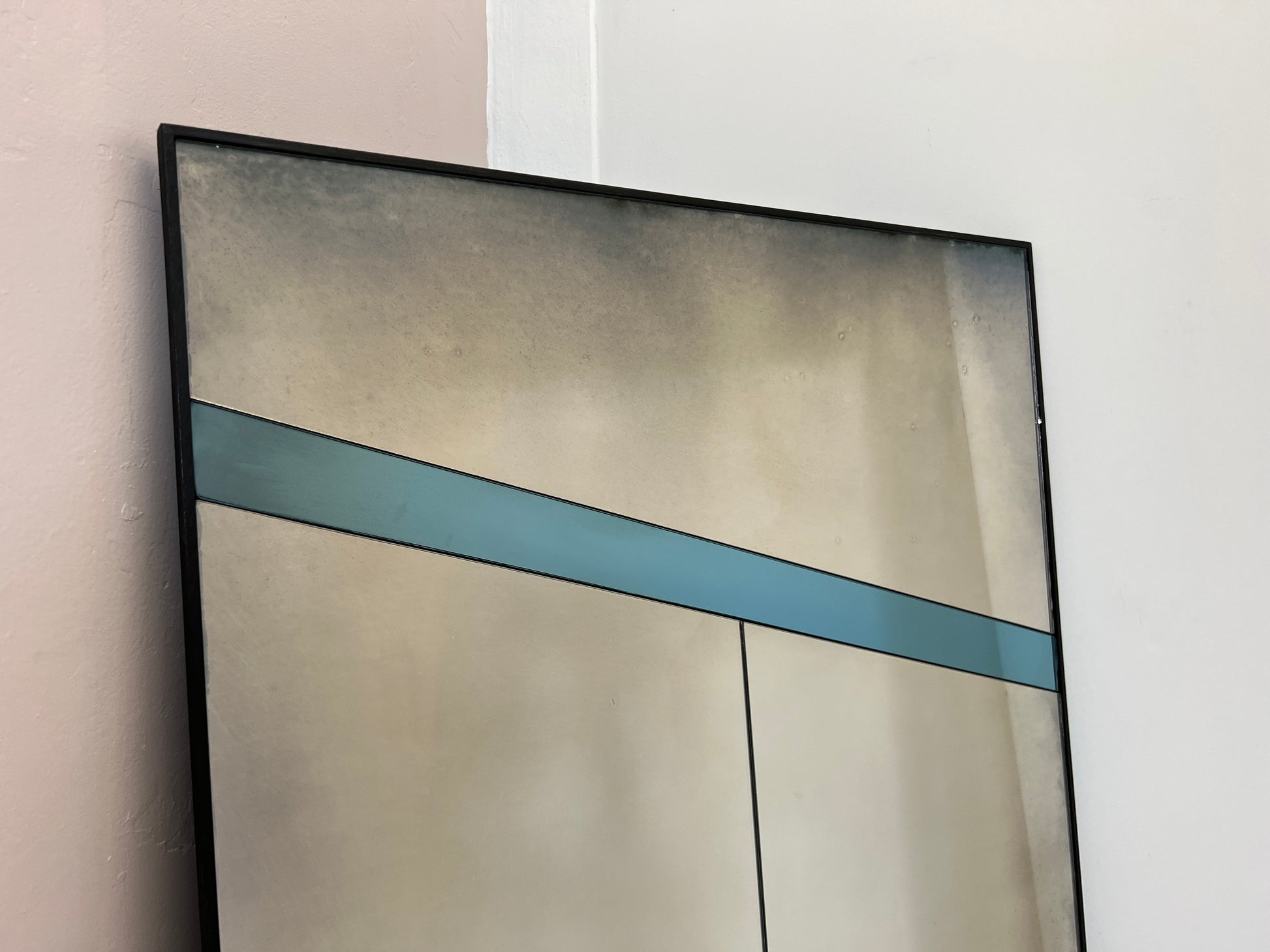 A one of a kind, unique mirror with a blue mirrored streak. This mirror has been fitted with our hand-silvered and distressed antiqued mirror glass, made in our workshop just outside of Bristol.